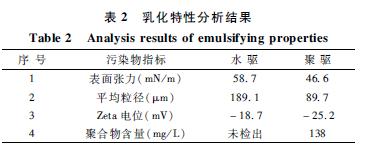 采油污水乳化特性测定中,采用表面张力仪法测定表面张力,采用库伦特粒度仪法测定粒径分布及平均粒径,采用Zeta电位仪法测定Zeta电位,采用淀粉碘化镉分光光度法测定聚合物含量。