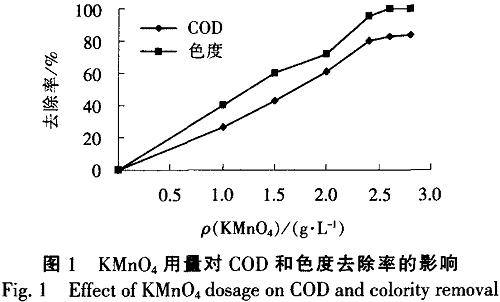 高锰酸钾投加量对去除有机物影响较大,因而试验首先不调节水样pH值.室温下投加不同量的高锰酸钾,反应30min,去除干扰离子后测量过滤液的COD浓度和色度。如图l所示。