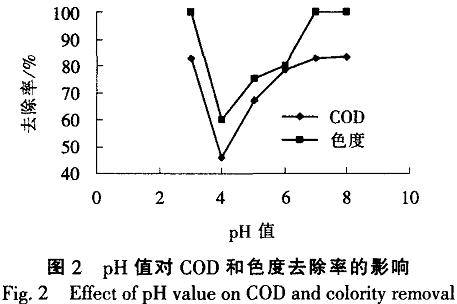 由于pH值会影响氧化还原体系的氧化还原电位,因此,试验时调节不同的pH值以考察pH值对有机污染物去除的影响。为确定最佳pH值,室温下按2.6g/L的比例加入固体高锰酸钾,反应30min.去除干扰离子后.测量过滤液的COD浓度和色度。如图2所示。