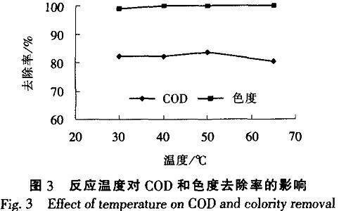 试验中控制不同的反应温度,以观察温度对有机物去除率的影响。不同温度下按2.6g/L的比例加入固体高锰酸钾,反应3Orain,去除干扰离子后.测量过滤液的COD浓度和色度。如图3所示。
