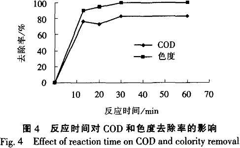 试验中控制不同的反应时间,以观察反应时间对有机物去除率的影响。室温下按2.6g/L的比例加入固体高锰酸钾,控制不同的反应时间,去除干扰离子后,测量过滤液的COD浓度和色度。如图4所示。