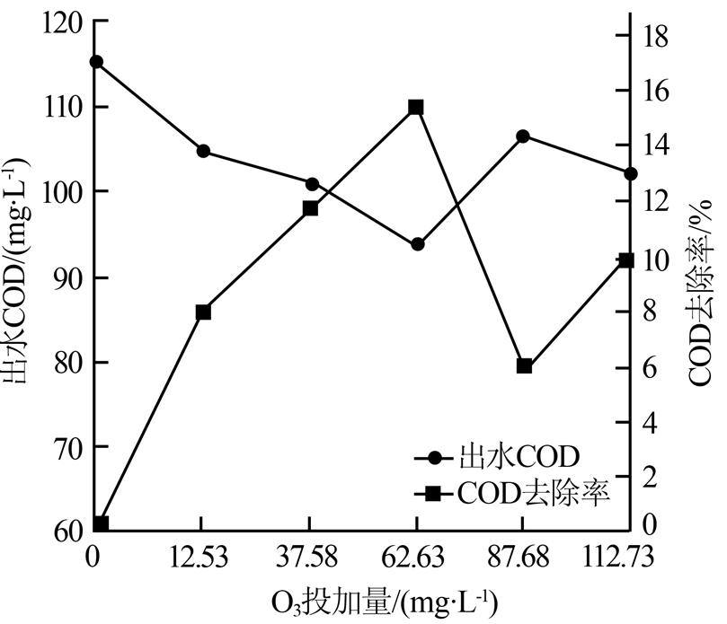 ¡¡¡¡ÓÉͼ 2¿ÉÒÔ¿´³ö£¬O3Ͷ¼ÓÁ¿Îª0¡«62.63 mg/Lʱ£¬Ëæ×ÅO3Ͷ¼ÓÁ¿µÄÔö¼Ó£¬³öË®COD³ÊÃ÷ÏÔϽµÇ÷ÊÆ¡£O3¿ÉÓëË®ÖÐOH- ͨ¹ý·´Ó¦Éú³ÉÑõ»¯ÐÔ¼«Ç¿µÄ¡¤OH¡²5¡³£º