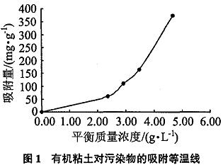 吸附是分子被有机粘土颗粒表面束缚的一种物理化学过程。颗粒物从水中吸附憎水有机污染物的量与颗粒物中有机质含量密切相关,当有机物在水中含量增高接近其溶解度时,有机污染物在颗粒物上的吸附等温线呈直线。分散染料废水中同时含有芳香族化合物和脂肪族化合物,有机粘土通过分配作用吸附脂肪族化合物,吸附量较高,由于有机粘土层间的有机相不是纯的烷基有机相,是由烷基和脂肪族化合物混合而成,因此化合物吸附能力进一步提高,使吸附等温线上翘。
