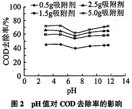 从图2可以看出,随着pH值的不断变化,COD去除率也相应发生变化。废水在酸性和碱性条件下,COD去除率较高,在中性条件下COD去除率较低。