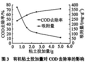 准确称取0.5,1.5,2.5,5.0g有机粘土,分别放人100mL广口三角瓶中,用量筒量取50mL水样,倒人预先放置有机粘土的三角瓶中摇匀。室温下将装有样品的三角瓶放人恒温水浴振荡器中,振荡强度150r/min,振荡20min后取出静置12h。在3600r/min转速下离心分离10rain,取上清液测COD。