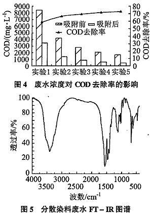 图4是废水浓度与COD去除效果的关系图。在一系列广口锥形瓶中,取1.5g有机粘土,不调节废水pH值,将50mL不同浓度的废水与有机粘土充分混合进行吸附试验,结果显示随着废水浓度的降低,COD去除率逐渐升高,但废水COD质量浓度低于2800Ing/L时,COD去除率增长缓慢,因此采用有机粘土吸附分散染料废水时,废水COD质量浓度不宜低于2800mg/L。