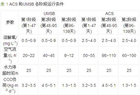 批量培养结束后,连续进水,HRT为25 h。在连续运行过程中,先后考察了3个COD负荷水平3.2~3.5、4.5~5.1、1.3~1.5 kg/(m3·d)。ACS和UMSB各阶段运行条件如表 1所示。在第1阶段获得稳定运行的情况下,第2阶段考察了冲击负荷对系统运行的影响,而第3阶段考察了较低负荷对系统运行的影响。
