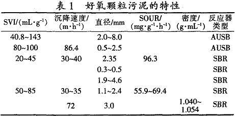 在好氧条件下,培养颗粒污泥的条件较为苛刻,并且在不同操作条件和培养目的下培育出的好氧颗粒污泥在颗粒大小、粒径分布、颜色、功能上也都存在着差异。好氧颗粒污泥的特性:表面光滑、较高密度和高强度、高生物量、耐冲击负荷、抗有毒物质。好氧颗粒污泥外观一般为橙黄色或浅黄色,周洵平等总结了不同反应器在各自条件下培养的好氧颗粒污泥的特性,见表1。