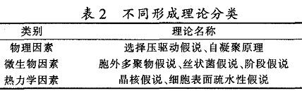 颗粒污泥的形成过程是一个包含物理、化学和生物作用的复杂过程,这个过程可以看作是在流体动力条件下.微生物自固定所形成的生物体聚团现象。由于操作条件、反应器类型、进水水质、培养目的不同,因此现有的形成机理并不能诠释所有颗粒污泥的形成情况。表2对不同的理论作了一个归类。