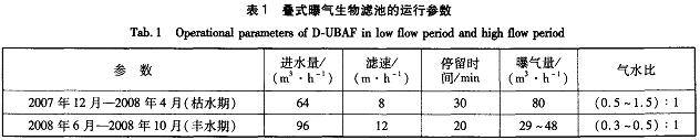 D—UBAF预处理试验规模为64—96In/h。DBAF的滤料粒径为8—12mm,厚为1.5m;UBAF的滤料粒径为3~5mm,厚为4m,滤速为8~12m/h,滤料接触时间为20~30rain;气水比为0.3~1.5;气水冲洗强度:水冲为6—8L/(m•s),气冲为l5~20L/(ITI•s)。