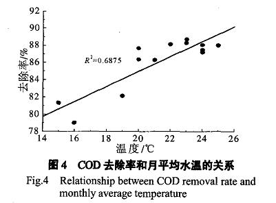 ½«CODÈ¥³ýÂÊÓëÔÂÆ½¾ùË®ÎÂ×÷ͼ£¬µÃµ½CODÈ¥³ýÂÊÓëÔÂÆ½¾ùË®ÎµĹØÏµÍ¼£¬¼ûͼ4¡£Ë®ÎµÍʱ£¬´¦ÀíЧÂʽµµÍ£¬ËæË®ÎÂÉý¸ß£¬´¦ÀíЧ¹ûÌá¸ß¡£¾¹ýÒ»Ôªº¯ÊýÏßÐÔÏà¹ØÐÔ¼ÆËãµÃµ½£¬CODÈ¥³ýÂʺÍζȵÄÏà¹ØÐÔΪ0£®83£¬ËµÃ÷CODÈ¥³ýÂÊËæË®Î±仯³ÊÏßÐÔ¹ØÏµ£¬±íÃ÷ÉúÎïĤ΢ÉúÎï»îÐÔËæË®Î±仯¹ØÏµÃÜÇУ¬Ë®Î¶Դ¦ÀíЧÂÊÓ°Ïì½Ï´ó¡£Òò´Ë£¬¶ÔÓڸ÷ÏË®´¦ÀíϵͳÀ´Ëµ£¬ÔÚ¶¬¼¾Ë®Î½µµÍµÄʱºò£¬Ó¦Êʵ±×¢ÒⱣΣ¬Ê¹ÏµÍ³´¦ÀíЧÂÊ´¦ÓÚÒ»¸öÏà¶ÔÎȶ¨µÄ״̬¡£Í¨¹ý¶Ô½Ó´¥Ñõ»¯³ØÉúÎïĤµÄÉúÎïÏྵ¼ì¹Û²ì£¬´ºÏļ¾ÆØÆø³ØÖÐÂֳ桢Ï߳桢ÀÛÖ¦³æ¼°ÖÓ³æµÈ΢ÐÍÔÉú¶¯Îï½Ï¶à£¬¶øÇÒ»îÔ¾£¬±íÃ÷³öË®ÖÐÓлúÎﺬÁ¿½ÏÉÙ£¬Ë®ÖʽϺᣡ£