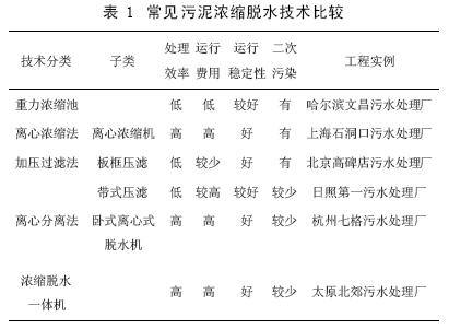 常见的污泥浓缩和脱水技术有以下几种: 重力浓缩法、机械浓缩法、板框压滤脱水、带式压滤脱水、离心脱水以及浓缩脱水一体机浓缩脱水。各浓缩脱水技术的比较见表1