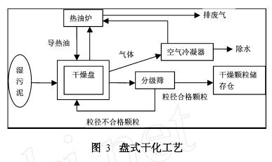 (2)盘式干化工艺先用外部热源加热一个油炉,再通过油体将热能传送到干燥盘。干燥盘有5~7层圆盘,污泥首先被均匀摊在顶层的圆盘上,主轴上的耙子将污泥颗粒从内推向外沿,送到下一层圆盘上,如此依次下滑。为了充分利用污泥颗粒本身的热量,在每层都有新污泥涂在污泥颗粒表面,颗粒不断增大,干燥后的颗粒一部分再返回盘式干燥器,另一部分粒径合格颗粒冷却后送入颗粒储存料仓。气体冷凝除水后经高温焚烧,彻底去除气味后高空排放。盘式干化工艺流程如图3。