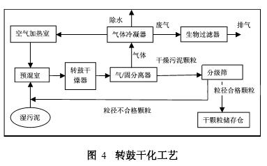 (3)转鼓干化工艺以天然气或沼气为能源,以空气为传热介质。湿污泥和部分干化颗粒在混合器中混合,由气流把它带入转鼓干燥器,污泥在转鼓干燥器中随气流以稳定的速度旋转前进,由内筒向外筒转移,污泥逐渐被干化成颗粒。被干燥的污泥颗粒与气体分离,经分级筛,粒径合格颗粒进入储料仓,粒径不合格的颗粒返回与湿污泥混合。气体处在一个循环系统中,通过转鼓干燥器的气体与污泥颗粒分离,再经冷凝器冷凝再次进入循环,少量废气经生物过滤器除臭后排出。转鼓干化工艺流程见图4。