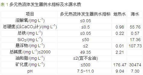 ¡¡¡¡¶àÔªÈÈÁ÷ÌåµÄˮԴѡÔñÐèÒª¿¼ÂÇÒÔÏÂ3µã£º(1)ˮԴ¿ÉÈ¡Á¿´ó£¬ÏµÍ³Ã¿ÈÕÏûºÄ´¦ÀíºóµÄˮΪ150¡«300 m3;(2)Ë®´¦ÀíÉ豸ռµØÃæ»ýС£¬Æ½Ì¨Äܹ»°Ú·Å;(3)³É±¾½ÏµÍ£¬¾¼ÃÐԺ᣸ù¾ÝÒÔÉϼ¸µã£¬Ä¿Ç°¿ÉѡȡµÄˮԴÓÐ2ÖÖ£ºµØÈÈË®¼°º£Ë®¡£Õë¶Ô²»Í¬µÄˮԴ£¬ÐèÑ¡ÔñÏà¶ÔÓ¦µÄË®´¦ÀíÉ豸£¬Ê¹¾»»¯Ö®ºóµÄË®ÄÜ´ïµ½¶àÔªÈÈÁ÷Ìå·¢ÉúÆ÷µÄ¹©Ë®Ö¸±ê¡£Ë®Ô´Ë®Öʼ°¶àÔªÈÈÁ÷Ìå·¢ÉúÆ÷µÄ¹©Ë® Ö¸±ê¼û±í 1¡£