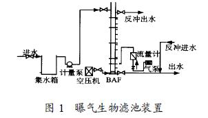 试验装置见图1, 反应器采用直径为15 cm、高280 cm 的有机玻璃柱, 每隔20 cm 设一个取样口。底部设有穿孔曝气管和反冲洗布水管, 污水由上部进入, 底部排出。以陶粒作为填料, 其中填料体积35 L, 填料层高200 cm, 填料粒径2~ 4 mm, 堆积密度Q= 1. 16 @103 kg/ m3。反冲洗采用气水联合反冲, 反冲液由顶部溢流口排放。