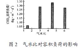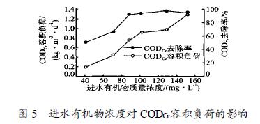 ( 3) 反应器CODCr容积负荷随进水有机物浓度的增加而增加。受气水比的限制, 当进水有机物质量浓度超过128 mg/ L 时, 有机物去除率略有下降。