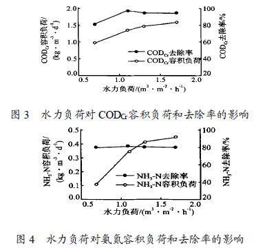 ( 2) 当水力负荷在0. 7 ~ 1. 7 m3/ ( m2# h) 范围内变化时, CODCr和氨氮的容积负荷均随水力负荷的增加而增加。水力负荷的变化对氨氮去除率的影响较小。