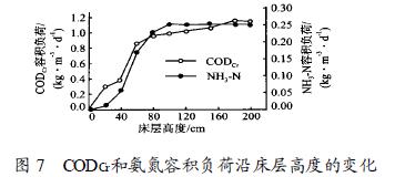 当碳氧化和硝化在同一反应器中进行时, 由于氧化有机物的异养菌和硝化氨氮的自养菌间要竞争生物膜表面空间和溶解氧, 因此在不同床层高度处氧化有机物和硝化氨氮的能力也不同152, 容积负荷和氨氮负荷沿床层高度的变化见图7。其中进水有机物质量浓度和氨氮质量浓度分别为122. 11 mg/ L和26. 9 mg/ L, 滤速为1. 04 m/ h, 气水比为3÷1。