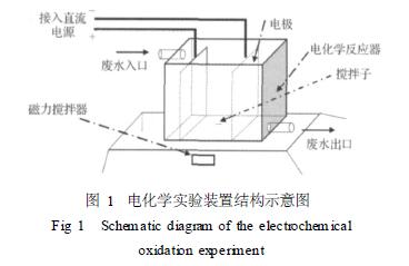 实验装置示意图见图1。实验中采用序批方式连续进行电催化处理。电解实验装置包括: ①方形(15 cm ×15 cm ×15 cm)玻璃钢电解槽一个; ②自制网格状钛基钌系掺锑氧化物电极,电极大小15 cm×10 cm,厚014 cm,有效面积01022 m2 ,阴极为不锈钢网; ③直流稳流电源及其他相应设施;其中直流电源、电极和电解槽是核心设备。