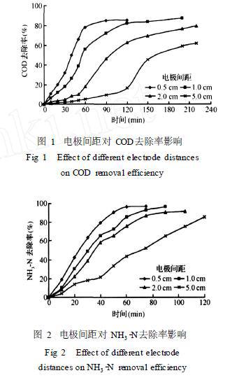 实验中,电极槽中渗滤液1000 mL, pH 值为715,在不添加电解质时,进行序批方式处理。不同极板间距时,渗滤液中COD 和NH32N 的去除效果见图1和图2。