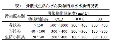 分散式污水污染源排放的主要污染物为动植物油类、COD、BOD5 、SS、TN、TP 等,其总的水质情况为,COD < 1000mg/ L ,BOD5 < 500mg/ L 、SS < 500mg/ L ,TN 为25~85 mg/ L , TP 为9~14 mg/ L 。但不同的污染源,其排水水质有差异,水质的变化主要受分散式生活污染源的性质所影响,譬如餐饮类污水,由于其中含有大量的厨余物、油脂类等耗氧性物质,因此其污染物排放浓度一般要比宾馆类和居住小区类的高,尤其是动植物油类。以上3 类污染源的排水水质如表1 所示[2 - 4 ] 。
