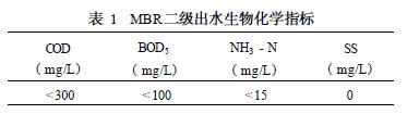 本实验进水为MBR处理焚烧厂垃圾渗滤液后的出水,MBR 的膜组件是聚丙稀材质的中空纤维膜。出水生物化学指标见表1。