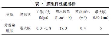经MBR处理后的出水直接进入纳滤膜装置,通过考察操作压力、pH值、运行时间和进水流量对纳滤膜分离效果的影响,确定本实验运行的最佳条件。本实验的纳滤膜处理流程采用一级一段循环式处理方式,即将部分浓缩水返回至原水箱与原有的进水混合,然后再通过膜组件分离,这样既能保证原水在膜表面有足够的流速,又不至于因回收率太低而造成原水的浪费。实验选用的膜材料是芳香聚酰胺卷式膜,由杭州凯洁膜技术有限公司提供,膜组件性能指标见表2。