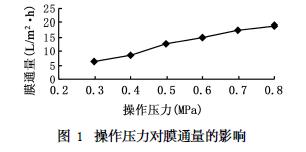 在恒定的流量( 20 L /h)和进水浓度(COD 为200 mg/L)下,实验操作压力从0. 3 Mpa增加到0. 8Mpa,每隔0. 1Mpa作为一个压力工作区,每个工作区运行30分钟,然后取样分析不同压力下膜通量和COD截留率的变化情况。。