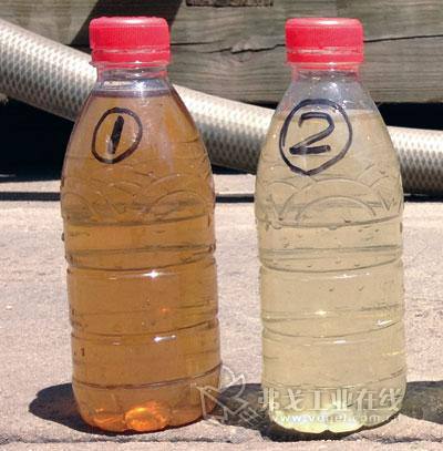 图试验取样照片:①为南京某焦化污水处理厂二沉池出水(即中试试验进水),②为经过“Ozone-BAF-Ozone”组合工艺处理后出水