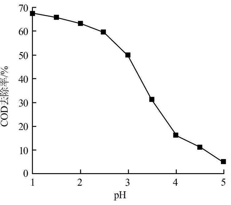 由图2可知,pH为1.0时COD去除率最高,为67.3%,随着pH的升高,COD去除率逐渐下降,当pH高于2.5时COD去除率出现较大幅度的降低。基于铁炭微电解对pH的需求以及药品经济性的考虑,选定酸析pH=2.5,出水COD为6 090 mg/L,去除率为59.4%。