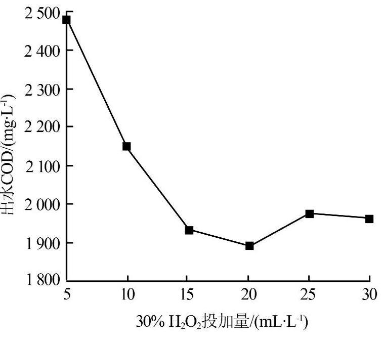 由图4可知,H2O2投加量在5~20 mL/L范围内,出水COD随着H2O2投加量的增加而降低。当H2O2投加量为20 mL/L时,出水COD达到最低,为1 900 mg/L。这是因为H2O2产生的羟基自由基(·OH)可参与有机物的氧化分解,降低了有机物的浓度。然而H2O2投加量大于20 mL/L时,出水COD反而升高,主要是由于H2O2不仅会产生·OH,而且是·OH的清除剂[7]。因此,为了保证Fenton氧化单元处理效果,同时还要经济有效地提高H2O2利用率,试验选择20 mL/L作为H2O2的投加量。
