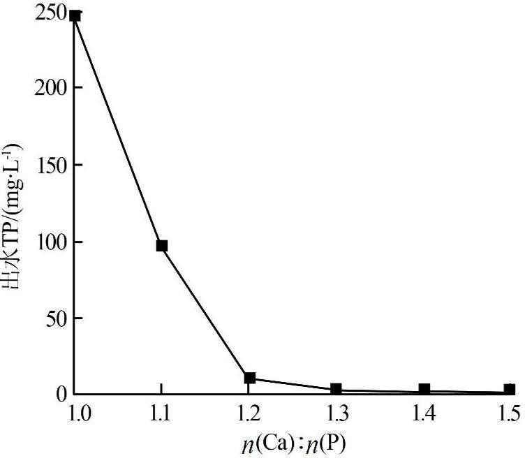 由图5可知,出水总磷浓度随着氯化钙含量的增加而降低。当n(Ca)∶n(P)=1.2时,出水总磷质量浓度为9.5 mg/L,去除率达到99.8%。继续增加氯化钙的投加量,总磷略有下降。综合除磷效率及经济性考虑,按n(Ca)∶n(P)=1.2进行氯化钙的投加。。