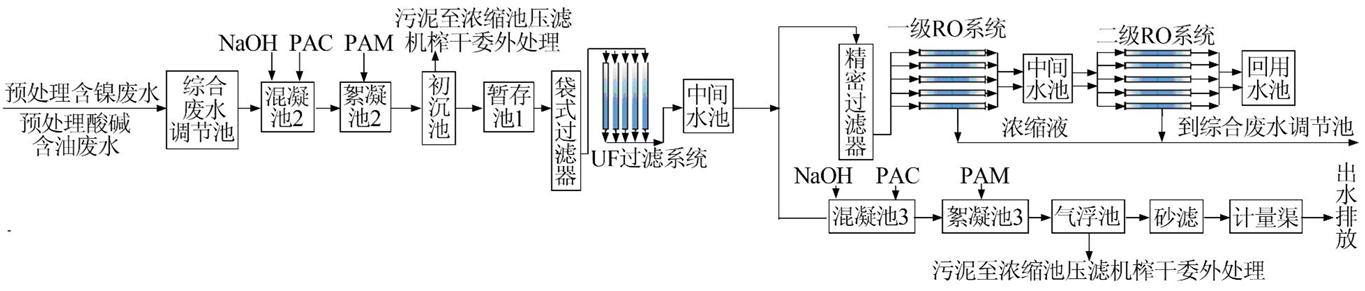 该企业废水经过处理后,要求废水排放指标稳定达到国家《污水综合排放标准》(GB 8978—1996)二级排放标准,即pH为6~9,COD≤100 mg/L,SS≤70 mg/L,石油类≤5 mg/L,色度≤50 mg/L,总镍达到《电镀污染物排放标准》(GB 21900—2008)表2标准,即总镍≤0.5 mg/L,实现约70%的出水回用,余下30%的出水接入市政污水管网到集中污水处理厂进行深度处理。