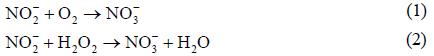 烧瓶浸渍在恒温水浴锅中以控制反应温度为40±1℃,溶液体积1L,搅拌速率300rpm,用氢氧化钠或盐酸动态调节反应体系的pH(调节精度±0.5),分别以流量为8L/min空气或30wt%双氧水为氧化剂,研究了亚硝酸盐中低浓度(C0=3.00、7.50、15.0、30.0mmol/L)和高浓度(C0=300mmol/L)亚硝酸根的氧化行为。亚硝酸根被空气(氧气)、双氧水氧化的化学反应方程式如式(1)~(2)所示。
