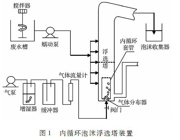 泡沫浮选分离技术是一种新型分离技术,对含量较低的重金属离子分离有着较好的分离效果。传统的泡沫分离理论认为,在泡沫分离过程中,吸附接近平衡后的气泡离开液相,在液相上方形成泡沫相。在泡沫相中,刚离开液相的气泡夹带很多的液体,持液量很高,随着气泡沿着轴向由下向上流动,其中一部分所夹带的液体由于重力作用由上向下流动,形成排液。为强化排液,提高富集率,学者研究设计了不同类型的泡沫分离塔。