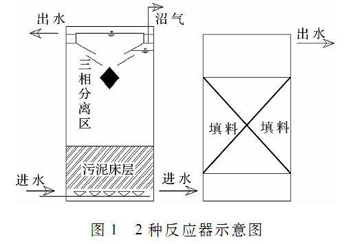 填料式水解酸化反应器和UASB水解酸化反应器在设计应用形式上分别属于膜法和泥法,它们都将反应器内的污泥停留时间(SRT)和水力停留时间(HRT)分离,以保证反应器内具有较高的微生物量,有利于反应器的高效运行。2种反应器构造见图1。