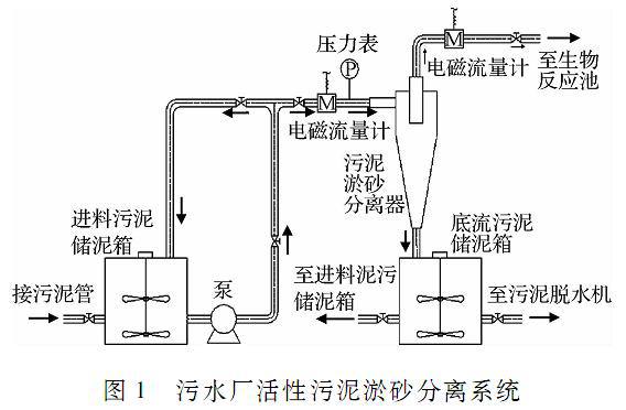 污水厂活性污泥淤砂分离系统如图1所示,核心设备为自主开发的污泥淤砂分离器。实验时,先将污水厂回流污泥泵入带污泥搅拌器的进料污泥储泥箱,通过调节阀门控制污泥混合液进入污泥淤砂分离器的压力,污泥混合液通过分离器后被分离为底流污泥和溢流污泥。。