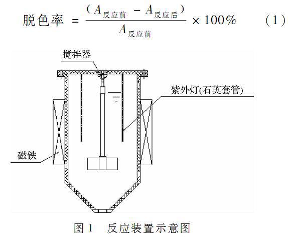 ·´Ó¦×°Öüûͼ*£¬Æä´óСΪ452mm*372mm*95mm¡£Ê×ÏȽ«Ä£Äâ·ÏË®ÖÃÓÚ·´Ó¦Æ÷ÖС£¿ªÆô½Á°èÆ÷ºÍ×ÏÍâµÆ£¬´Å³¡Ç¿¶ÈÓÉ´ÅÌúµÄ¹æ¸ñ¿ØÖÆ£¬µ÷½ÚPHÖµËùÓõÄËá¼î·Ö±ðΪÌå»ý±ÈΪ10%µÄÑÎËáºÍ1mol/LµÄNaOHÈÜÒº¡£±ß½Á°è±ßÒÀ´Î¼ÓÈëÒ»¶¨Á¿µÄ´ÅÐÔ¹â´ß»¯¼Á£¬´ý·´Ó¦ÍêÈ«ºó£¬È¡ÉÏÇåÒº²â¶¨ÆäÎü¹â¶ÈA¡£ÍÑÉ«ÂÊÓÉÏÂʽÇóµÃ£º