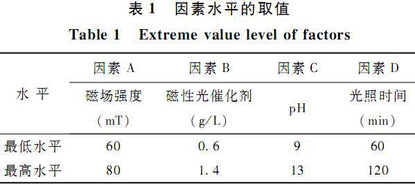 ͨ¹ýDesign-Expert 7.0.0Èí¼þ·ÖÎöµÃµ½×î¼Ñ¹¤ÒÕÌõ¼þ£º´Å³¡Ç¿¶È73.95 mT£¬´ÅÐÔ¹â´ß»¯¼ÁͶ¼ÓÁ¿1.13 g/L£¬Ä£Äâ·ÏË®pHÖµ13£¬¹âÕÕʱ¼ä120 min¡£ÔÚ×î¼Ñ¹¤ÒÕÌõ¼þϽøÐÐʵÑ飬ÍÑÉ«ÂÊΪ88.60%¡£