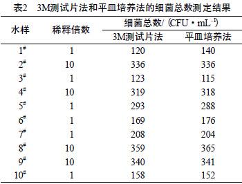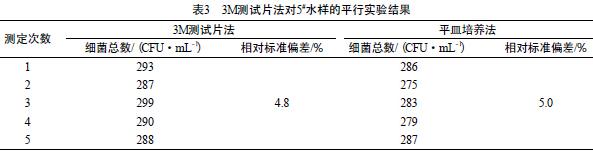 3M²âÊÔÆ¬·¨¶Ô5#Ë®ÑùµÄƽÐÐʵÑé½á¹û¼û±í3¡£Óɱí3¿É¼û£¬3M²âÊÔÆ¬·¨ºÍƽÃóÅàÑø·¨µÄÏà¶Ô±ê׼ƫ²î·Ö±ðΪ4.8%ºÍ5.0%£¬ËµÃ÷3M²âÊÔÆ¬·¨±ÈƽÃóÅàÑø·¨¸ü¾«ÃÜ¡£
