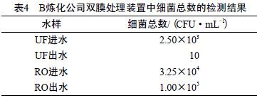 BÁ¶»¯¹«Ë¾Ë«Ä¤´¦Àí×°ÖÃÖÐϸ¾ú×ÜÊýµÄ¼ì²â½á¹û¼û±í4¡£Óɱí4¿É¼û£ºUF³öË®µÄϸ¾ú×ÜÊý½öΪ10CFU/mL£¬Ï¸¾úÈ¥³ýÂÊ´ïµ½ÁË99.6%£¬±íÃ÷UFϵͳ¶Ôϸ¾úÓнϺõÄÈ¥³ýЧ¹û£»RO½øË®µÄϸ¾ú×ÜÊýÊÇUF³öË®µÄ3 250±¶£¬±íÃ÷·ÏË®´ÓUF³ö¿ÚÁ÷ÖÁRO½ø¿ÚµÄ¹ý³ÌÖÐÊܵ½ÁËÎÛȾ£¬»òÒò¹Ü·̫³¤ÇÒ»·¾³ÊÊÒ˵¼ÖÂϸ¾ú×ÌÉúѸËÙ£¬Òò´Ë£¬ÔÚʵ¼ÊÔËÐйý³ÌÖÐÒª¶Ô¿ÉÄÜÒýÈë΢ÉúÎïÎÛȾµÄ»·½Ú£¨ÈçUF×°ÖúóÐøµÄÖмäË®Ïä¡¢RO×°ÖõÄǰÖñ£°²¹ýÂËÆ÷µÈ£©¼ÓÇ¿ÒÖ¾ú´ëÊ©£»RO³öË®µÄϸ¾ú×ÜÊýÊÇRO½øË®µÄ3.1±¶£¬²»½µ·´Ôö£¬ÓÉ´Ë¿ÉÅжÏROĤÒÑÊܵ½Î¢ÉúÎïµÄÎÛȾ£¬ÐèÒª²Éȡɱ¾ú´ëÊ©¡£
