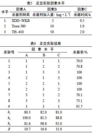 È¡BÁ¶»¯¹«Ë¾RO½øË®£¬·Ö±ð¼ÓÈëɱ¾ú¼ÁXDDWKB£¬Trsea 380£¬TH-410£¬ÔÚʵÑéÊÒRO×°ÖÃÉϽøÐж¯Ì¬É±¾úʵÑé¡£ÒÀ¾ÝL9£¨33£©Õý½»±íÉè¼ÆÊµÑ飬ɸѡÊÊÒ˵Äɱ¾ú¼ÁÖÖÀࡢɱ¾ú¼Á¼ÓÈëÁ¿ºÍɱ¾úʱ¼ä¡£²ÉÓÃ3M²âÊÔÆ¬·¨²â¶¨É±¾úǰºóË®ÑùµÄϸ¾ú×ÜÊý£¬¼ÆËãɱ¾úÂÊ£¬±È½Ï¸÷ɱ¾ú¼ÁµÄɱ¾úЧ¹û¡£É±¾ú¼Á¼ÓÈëÁ¿ºÍɱ¾úʱ¼äµÄȡֵ·¶Î§¸ù¾Ýɱ¾ú¼Á¹©Ó¦ÉÌÌṩµÄʹÓÃ˵Ã÷È·¶¨¡£