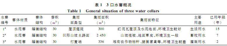 这3种集雨面是西北农村集雨窖普遍具有的几种集雨模式,其他则较少,选择该地进行窖水水质特性研究具有代表性。3口水窖具体情况如表1所示。