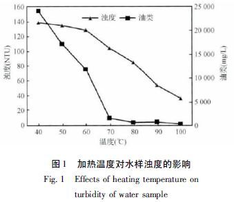 ÔÚ¼ÓËáÁ¿Îª1£®0 mL 98% H2SO4/100 mL È黯ҺÌõ¼þÏ£¬¼ÓËáºóµÄÈ黯ҺÔÚ³£ÎÂ״̬ÏÂÈÔ±£Îȶ¨¡£ÔÚ¼ÓÈÈʱ¼ä2 h Ìõ¼þÏ£¬·Ö±ð½«¼ÓÈÈζȿØÖÆÔÚ(40¡À1)¡æ¡¢(50¡À1)¡æ¡¢(60¡À1)¡æ¡¢(70¡À1)¡æ¡¢(80¡À1)¡æ¡¢(90¡À1)¡æ¡¢(100¡À1)¡æ£¬Ëæ×żÓÈÈζȵÄÉý¸ß£¬ÌåϵÎȶ¨µÄÈ黯ҺÖð½¥³öÏÖÁËÓÍË®½çÃæµÄ·ÖÀ룬ϲãΪ¾ßÓÐÒ»¶¨×ǶȵĻÆÉ«Ë®²ã£¬Öмä²ãΪ»Ò°×É«µÄÈ黯¼Á²ã£¬ÉϲãΪÓÍ²ã¡£Ëæ×ÅζȵÄÉý¸ß£¬Ë®²ãµÄºñ¶È²»¶ÏÔö´ó£¬ÓÍË®·ÖÀëЧ¹û¸üΪÃ÷ÏÔ£¬ÔÚ100¡æ´¦Ë®²ãºñ¶È´ïµ½×î´ó¡£Ï²ãË®Ñù²â×Ƕȷ¢ÏÖ£¬ÔÚ40¡«60¡æÊ±£¬Ï²ãË®Ñù×ǶȻù±¾Îޱ仯ÇÒ×ǶȽϸߣ¬ÔÚ70¡«100¡æÊ±£¬Ï²ãË®Ñù×ǶÈÏÔÖø½µµÍ£¬Í¬Ê±Ï²ãË®Ñù²âÓÍÀຬÁ¿·¢ÏÖ£¬ÔÚ70¡æÇ°ÓÍÀຬÁ¿´¦Óڽϸßˮƽ£¬µ«µ±¼ÓÈÈζȴóÓÚ70¡æÊ±ÓÍÀຬÁ¿´ó´ó½µµÍ£¬Èçͼ1 Ëùʾ¡£ÓÉ´ËÍÆ¶Ï£¬ÔÚ70¡æÒÔÏÂʱ¼ÓÈÈζȲ»×ãÒÔÍêÈ«ÆÆ»µÓÍË®½çÃæµÄ½çÃæÄ¤£¬Ê¹µÃË®ÏàÖÐÈÔÈܽâÁ˲¿·ÖÓÍÀàÎïÖÊ£¬µ«µ±¼ÓÈÈζȴóÓÚ70¡æÊ±£¬ÓÉÓÚÒºÖéµÄ¾Û½áºÍÓÍÏàÕ³¶ÈµÄ½øÒ»²½½µµÍ£¬ÓÍË®½çÃæµÄ½çÃæÄ¤Ç¿¶È´ó´ó½µµÍ£¬ËùÒÔËæ×ÅζȵÄÌá¸ß£¬ÓÍË®·ÖÀë¹ý³Ì½øÐнϿ졣Òò´Ë£¬ÔÚ¼ÓÈÈζÈ100¡æÊ±£¬¿ÉÒÔ»ñµÃÁ¼ºÃµÄÆÆÈéЧ¹û£¬µ«ÊÇ¿¼Âǵ½100¡æÊ±È黯ҺˮÏàÔÚ·ÐÌÚ¹ý³ÌÖÐÕô·¢½Ï¿ì£¬Òò´Ë½«¼ÓÈÈζȿØÖÆÔÚ95¡æ½Ï¼Ñ¡£