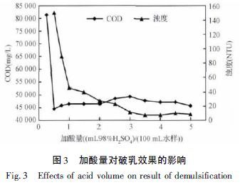 ͬʱ£¬ÆäCOD ³ÊÏÈÔöºó½µµÄÇ÷ÊÆ£¬ÔÚ¼ÓËáÁ¿Îª3£®0 mL H2SO4/100 mL È黯ҺʱCOD ×î¸ß£¬Ôì³ÉÕâÒ»Çé¿öµÄÔÒòÀàËÆÓÚ¼ÓÈÈʱ¼ä¶ÔÆÆÈéЧ¹ûµÄÓ°Ï죬¼ÓËáÁ¿µÄÔö¼ÓʹµÃ·´Ó¦²úÎïÈÜÓÚË®ÖеÄCOD Ôö¶à£¬µ«ÓÉÓÚÆÆÈé¹ý³Ì×ÜÌåÏò×ÅÓÍË®³¹µ×·ÖÀëµÄ¹ý³Ì½øÐУ¬Òò´ËϲãË®ÑùÖÐCOD ×îÖÕ±íÏÖ³öϽµÇ÷ÊÆ¡£Òò´Ë£¬ÈÏΪ¼ÓËáÁ¿ÔÚ4£®0¡«5£®0 mL H2SO4/100 mL È黯Һʱ£¬¾ßÓÐ×îºÃµÄÆÆÈéЧ¹û£¬µ«ÊÇ¿¼Âǵ½¼ÓËáÁ¿µÄÔö¶àʹµÃ·´Ó¦ºóÈÜÒºµÄpH ¹ýµÍ(Èç±í1 Ëùʾ)£¬»áÔì³ÉºóÐøÖкÍËùͶ¼ÓµÄÖкͼÁÒ©¼ÁÓÃÁ¿Ôö´ó£¬ÒÔ¼°ºóÐøµÄÑáÑõ´¦ÀíSO42-Ũ¶È¹ý¸ßµÄÎÊÌ⣬Òò´Ë½«¼ÓËáÁ¿¿ØÖÆÔÚ1£®0 mL 98% H2SO4/100 mL È黯Һ£¬Í¬Ñù¿ÉÒÔ»ñµÃ½ÏΪÀíÏëµÄÆÆÈéЧ¹û¡£