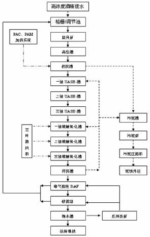 酒精生产中的废水为可生化性较好的高浓度有机污水,适宜采用生化处理工艺,废水中混有一些杂质和悬浮物,需先对其进行预处理,实现固液分离。采用混凝沉淀+ 三级厌氧(UASB)+三级生物接触氧化+沉淀+BAF +砂滤器的工艺。