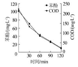 ͼ1 ³ôÑõÑõ»¯¶Ô±½·Ó¼°CODµÄÈ¥³ýЧ¹û