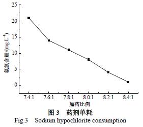 ´ÓʵÑé¹ý³Ì¿´£¬ÔË®°±µª¹ý¸ß£¬Ò©¼ÁÏûºÄ´óÇÒ´¦ÀíЧ¹ûºÜ²»ÀíÏë¡£Ö÷ÒªÔÒòÊÇËæ×ÅÒ©¼ÁµÄÔö¼Ó£¬pH Öð²½Ï½µ£¬ÖÕµãpH=2.5£¬²»ÀûÓÚ·´Ó¦½øÐУ¬ÓàÂȲÐÁô½Ï¶à¡£ÈôÒª¼Ó×ã¹»µÄ¼îÖкÍÖÁºÏÊÊpH£¬µ±Ñõ»¯1 mg/L NH4+-N ʱ£¬Ðè3.6 mg/L µÄ¼î¶È(ÒÔCaCO3 ¼Æ)À´ÖкÍ[2]£¬ÔË®°±µªÅ¨¶ÈÔ½¸ß£¬ÆäÐèÒª¼ÓÈëµÄ¼îÔ½¶à£¬´Ó¾¼ÃµÄ½Ç¶È³ö·¢£¬²»ºÏËã¡£¶øÔË®°±µªÐ¡ÓÚ100 mg/L£¬Ëæ×ÅÒ©¼ÁµÄÔö¼Ó£¬°±µªÏ½µºÜÃ÷ÏÔ¡£ÇÒ´¦Àíºó°±µªÐ¡ÓÚ10 mg/L ʱ£¬ÆäpH=5.5¡«6.0£¬Ö»Ðè¼ÓÉÙÁ¿µÄ¼îµ÷ÖÁÖÐÐÔ£¬¾ÍÄÜ´ïµ½ÅÅ·ÅÒªÇó¡£