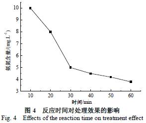 ´ÓʵÑé¹ý³Ì¿´£¬Ëæ×Å·´Ó¦Ê±¼äµÄÑÓ³¤£¬°±µªµÄŨ¶ÈÖð²½Ï½µ¡£10¡«30 min Ö®¼ä£¬°±µªÏ½µ·ù¶ÈºÜ´ó£¬Ð§¹ûºÜÃ÷ÏÔ¡£µ«ÊÇ·´Ó¦Ê±¼ä¼ÌÐøÑÓ³¤£¬ÓÉÓÚÒ©¼Á¼¸ºõÏûºÄÍêÈ«£¬°±µªÏ½µµÄ·ù¶ÈºÜСÁË¡£Òò´Ë£¬ÎªÁËÌá¸ßÕû¸ö´¦ÀíЧÂÊ£¬·´Ó¦Ê±¼äΪ30 min¡£